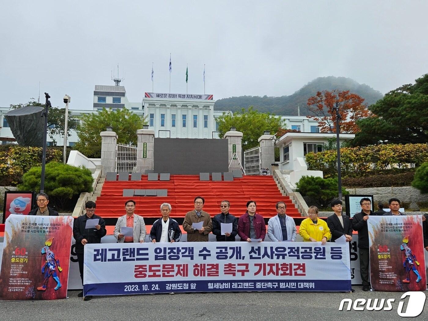 “김진태 지사 인수위 시절부터 책임 묻겠다는 약속 지켜야”“전임 도정에서 선사유적 완공 약속했으나, 여전히 허허벌판”혈세 낭비 레고랜드 중단 촉구 범시민대책위원회가 24일 오전 강원도청 앞에서 기자회견을 열고 강원도에 레고랜드의 정확한 입장객수와 수입을 공개하고, 책임자 문책을 촉구했다.2023.10.24 한귀섭 기자관련 키워드춘천레고랜드한귀섭 기자 '정원의 호수, 피어나는 춘천' 2032 국제정원박람회 구상춘천경찰서, 불법 환전 영업 게임장 운영 업주·종업원 등 3명 입건관련 기사'레고랜드 사업 과정 논란' 최문순 전 지사, 내년 3월 첫 공판'장애인 접근성 향상' 레고랜드 열린관광지로 변신춘천시, 레고랜드 코리아 포함 춘천투어패스 12시간권 출시춘천시, 자율주행자동차 시범운행지구 지정설악산에선 '마지막 단풍' 즐기고, 스키장에선 '은빛 설원' 질주