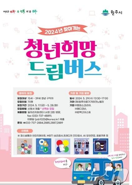 지역 기업 3곳 탐방·체험 기회 제공… 28일까지 선착순강원 원주시의 '2024년 1차 찾아가는 청년 희망드림버스' 안내 포스터. (원주시 제공) 2024.5.20/뉴스1관련 키워드의료기기원주채용설명청년희망드림버스원주의료기기종합지원센터신관호 기자 '경제도시' 외친 민선 8기 원주시…기업투자유치 1조 육박'CES 2026' 참가한 원주 기업들 191만여 달러 계약 성과관련 기사'경력단절여성 구인구직 해피데이' 25일 원주시청서원주시 '유치기업 채용설명회' 15일 개최