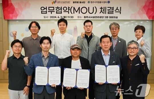 취약계층 주거환경 개선, 도시환경정화 등 협력강원 원주시시설관리공단이 3일 공단 2층 대회의실에서 봉주르봉사단, 원주시자원봉사센터와 지역 사회공헌 활동을 위한 업무협약을 체결한 가운데, 이날 참석자들이 기념사진을 촬영하고 있다. (원주시시설관리공단 제공) 2024.6.3/뉴스1관련 키워드원주시시설관리공단봉주르봉사단이봉주조남현신관호 기자 평창군, 올해 공공하수도 신·증설 사업 165억 투입정선군, 3년간 고향사랑기부 6억 돌파…답례품 확대