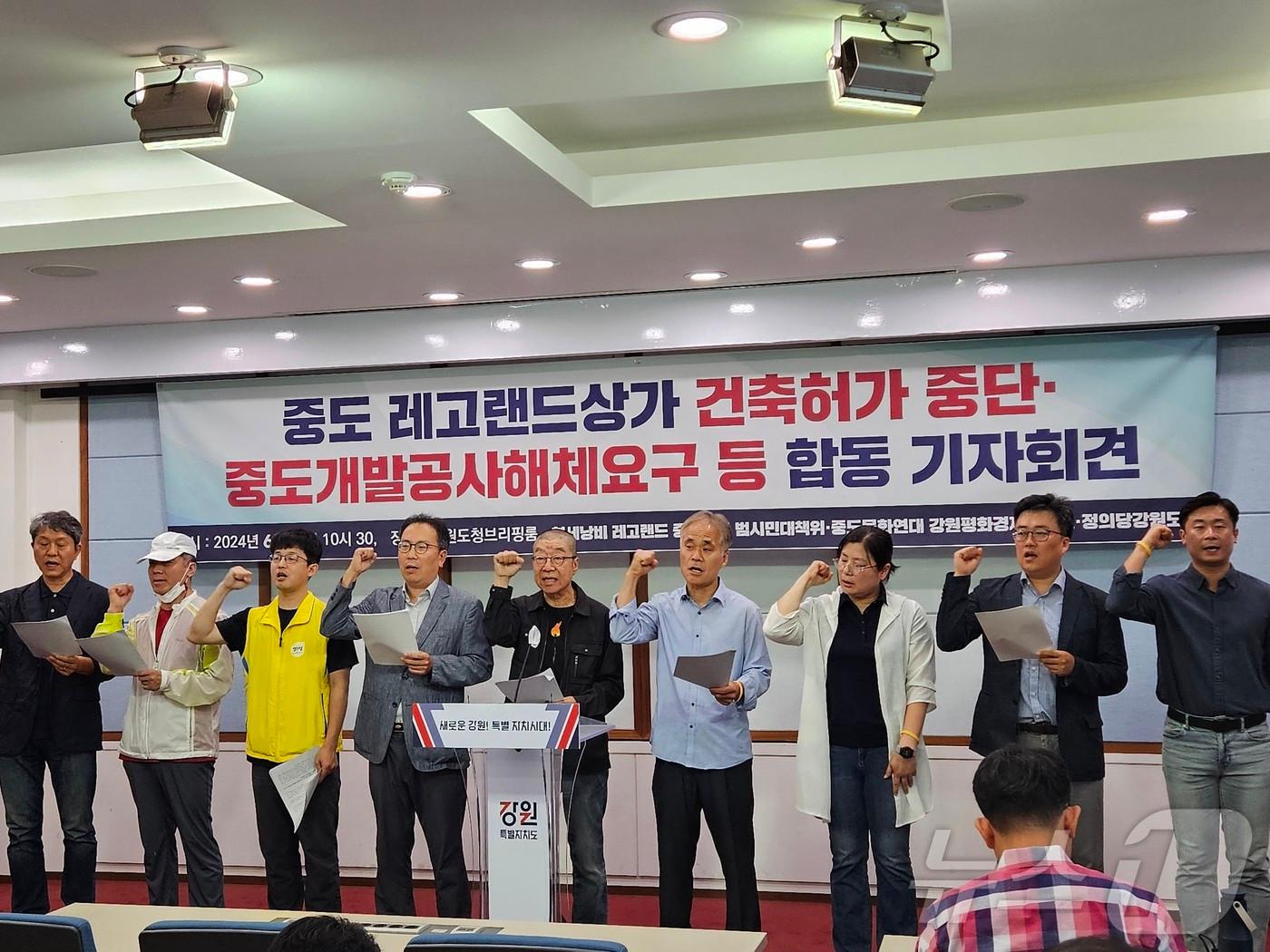 강원평화경제연구소·중도문화연대·정의당 강원 12일 기자회견강원평화경제연구소·중도문화연대·정의당 강원도당은 12일 도청 브리핑룸에서 기자회견을 갖고 레고랜드 상가 건축허가 중단과 중도개발공사 해체를 촉구했다.2024.6.12 한귀섭 기자관련 키워드강원레고랜드춘천한귀섭 기자 강원경찰청, '휴대용 열화상 카메라' 등 맞춤형 장비 9종 도입신축 공사·전원주택 분양 미끼로 20억 원 가로챈 50대 재판행관련 기사'레고랜드 사업 과정 논란' 최문순 전 지사, 내년 3월 첫 공판'장애인 접근성 향상' 레고랜드 열린관광지로 변신춘천시, 레고랜드 코리아 포함 춘천투어패스 12시간권 출시춘천시, 자율주행자동차 시범운행지구 지정설악산에선 '마지막 단풍' 즐기고, 스키장에선 '은빛 설원' 질주