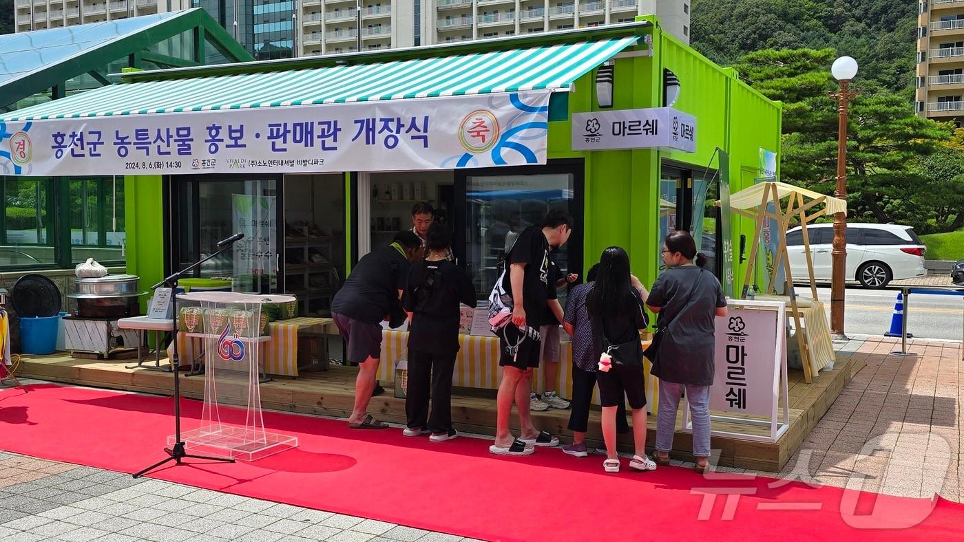 비발디파크 스키장 입구에 문 열어매일 오전 10시부터 오후 7시까지 운영홍천군 농특산물 홍보판매관.(홍천군 제공)/뉴스1홍천군 농특산물 홍보판매관 개장식.(홍천군 제공)/뉴스1관련 키워드강원홍천비발디파크농특산물판매관마르쉐이종재 기자 강원도, 핵심 광물 '텅스텐' 육성 방안 발표…"100% 자급 체계 구축"양구군, 천연기념물 산양 보호 나선다…먹이 공급·밀렵 방지 홍보관련 기사"철 지난 유행이라고?"…위기라던 K-스키장 '화려한' 부활"오션월드 가면 스노위랜드 공짜"…비발디파크, '1+1' 혜택강원도, 홍천서 '강원지역산업 정책워크숍''중소기업 수출 판로 확대'…홍천군, 해외 바이어 초청 수출 상담"겨울왕국으로 오세요"…'강원 스노우 페스타' 동남아 관광객에 손짓