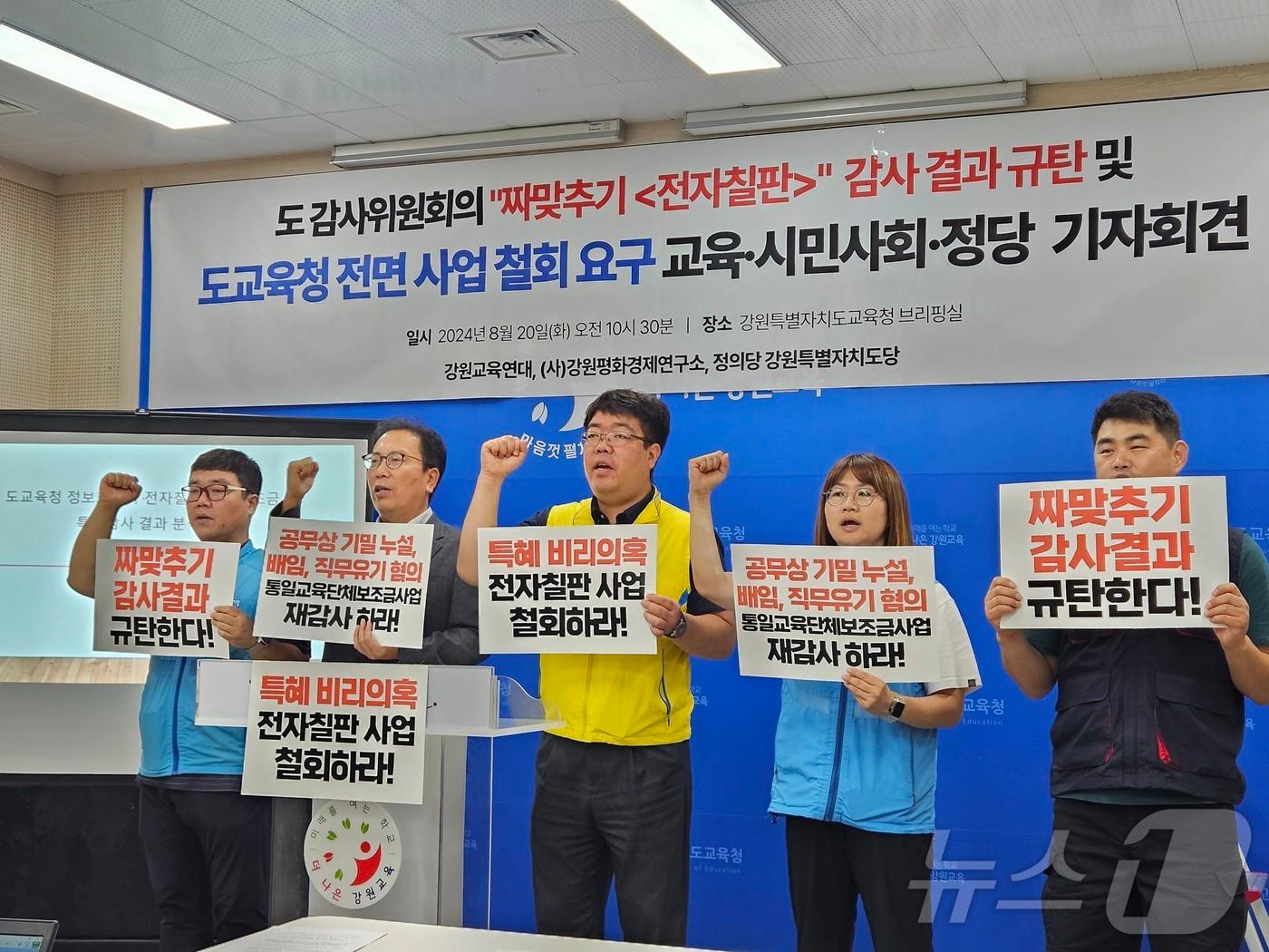 “징계 담당자 소명하지 않고, 교육청이 감사 안하면 수사의뢰”도감사위, 전자칠판 특혜 의혹 감사서 혐의 없음 결론 내려강원교육연대, 강원평화경제연구소, 정의당 강원도당이 20일 도교육청 브리핑룸에서 기자회견을 갖고 강원도 감사위의 감사결과를 규탄하고 전자칠판 사업 전면 철회를 촉구하고 있다.2024.8.20 한귀섭 기자강원도교육청.(뉴스1 DB)관련 키워드강원교육청전자칠판감사한귀섭 기자 강원교육청, 교육감입학전형 고등학교 신입생 5487명 23개교 추첨 배정강릉·동해·삼척·강원중부산지·남부산지 강풍주의보 발효관련 기사강원교육·시민단체 "1심 당선무효형 선고 신경호 교육감 물러나라"강원 교육단체, '공무원 선거 개입 의혹' 강원교육청 간부 수사의뢰강원교육청, 4차 산업혁명 시대 디지털 기반 교육혁신 박차