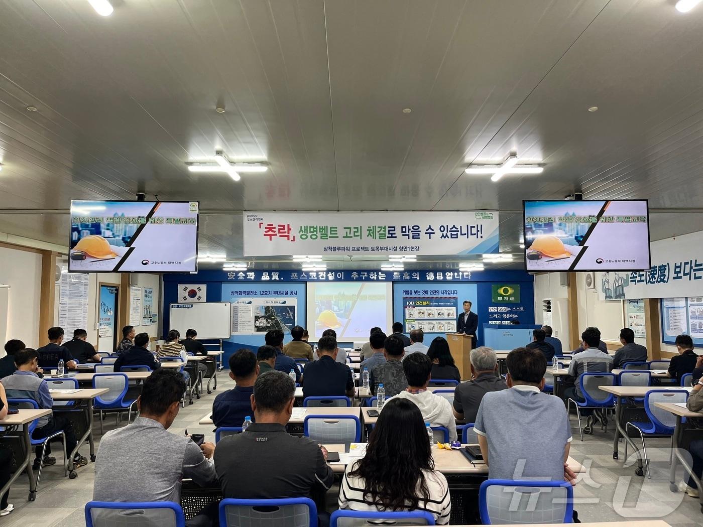 고용노동부 태백지청이 24일 삼척시 관내 근덕·도계농공단지 입주업체 사업주 및 지자체 발주 공사 현장소장을 대상으로 안전 특별교육을 하고 있다.(고용노동부 태백지청 제공) 2024.9.24/뉴스1관련 키워드고용노동부태백지청삼척특별교육안전이종재 기자 강원도, 핵심 광물 '텅스텐' 육성 방안 발표…"100% 자급 체계 구축"양구군, 천연기념물 산양 보호 나선다…먹이 공급·밀렵 방지 홍보관련 기사고용노동부 태백지청, 삼척시‧운영사업장 근로자 대상 '안전보건교육'노동부 태백지청·삼척시, 폭염 대비 외국인 고용농가서 합동 점검고용노동부 태백지청, 안전조치 우수사업장 현장 견학고용노동부 태백지청, 삼척장미꽃축제 현장서 합동 안전 점검고용부 태백지청, 건설업 중대재해 감축 우수 현장 참관 교육