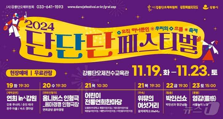 19~25일 강릉단오제전수교육관서2024년 단단단페스티벌 홍보물.(강릉단오제위원회 제공) 2024.11.15/뉴스1관련 키워드단단단페스티벌강릉단오제위원회강릉축제강릉윤왕근 기자 양양군의회, 전국 기초의회 첫 'AI 의정 보좌관' 도입강릉시, 야간 돌봄 공백 메운다…자정까지 '연장돌봄' 시행관련 기사강릉서 즐기는 으뜸 예술제…'단단단 페스티벌' 27일 개막