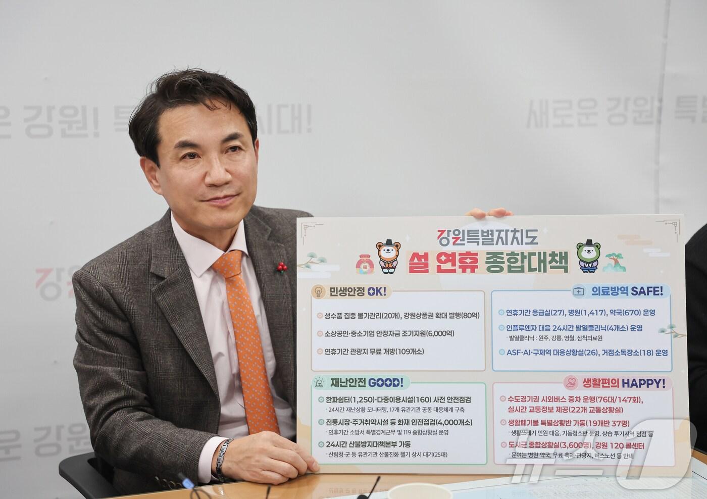 긴급 상황 신속 대응…사과·배 등 성수품 물가 집중 관리김진태 강원특별자치도지사가 20일 기자간담회를 열고 오는 25~30일 설 연휴 종합대책 추진방안에 대해 설명하고 있다.(강원도 제공) 2025.1.20/뉴스1설연휴 종합대책 현황판.(강원도 제공)/뉴스1관련 키워드강원설연휴종합대책이종재 기자 강원도, 핵심 광물 '텅스텐' 육성 방안 발표…"100% 자급 체계 구축"양구군, 천연기념물 산양 보호 나선다…먹이 공급·밀렵 방지 홍보관련 기사'눈 폭탄'에 뱃길·하늘길 끊기고 교통사고 '속출'…험난한 귀성길(종합2보)"고향 어떻게 가나"…폭설에 하늘길·뱃길 끊기고 사고 속출(종합)귀성길 덮친 '눈폭탄'…영동고속도 '10중 추돌' 등 곳곳 눈길 사고(종합2보)'폭설에 사고·정체' 험난한 귀성길…서울→부산 6시간(종합2보)원주시, 25~30일 연휴대비 종합대책상황반 운영