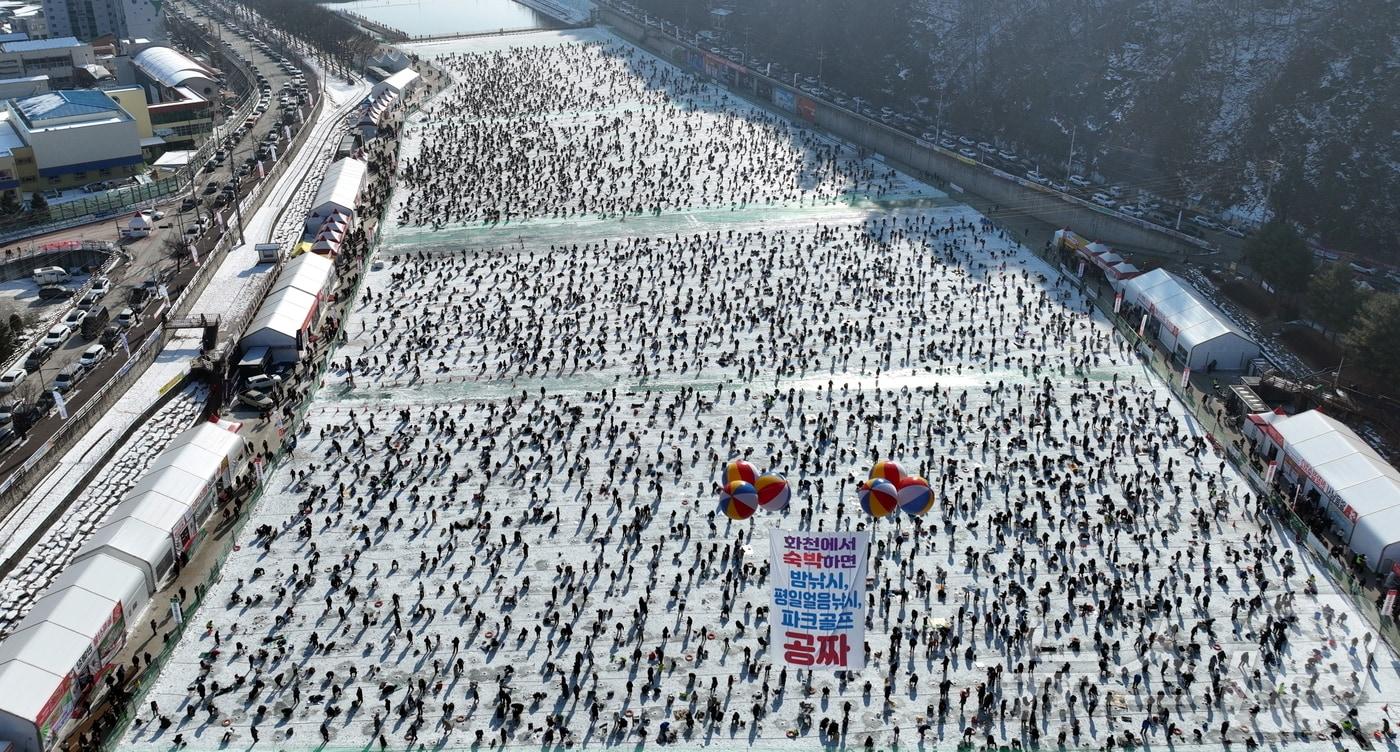 24일 오후 기준 지난 11일 개막 후 누적 방문객 102만명축제 2월 2일까지 진행주말인 18일 오전, 강원 화천산천어축제장을 찾은 관광객들이 산천어 얼음낚시를 즐기고 있다.(화천군 제공) 2025.1.18/뉴스1 ⓒ News1 윤왕근 기자이한경 이한경 행정안전부 재난안전관리본부장이 23일 강원 화천산천어축제장을 방문해 얼음판 결빙상황과 주요 안전시설물 등을 점검하고 있다. (행정안전부 제공)2025.1.23/뉴스1'산타의 고향' 핀란드 로바니에미시에서 날아온 '진짜 산타클로스'와 요정 '엘프'가 18일 강원 화천산천어축제장에 마련된 산타우체국을 방문해 관광객들과 기념촬영을 하고 있다.(화천군 제공) 2025.1.18/뉴스1 주말인 18일 오전, 강원 화천산천어축제장을 찾은 외국인 관광객들이 산천어 얼음낚시를 즐기고 있다.(화천군 제공) 2025.1.18/뉴스1 관련 키워드화천산천어축제한귀섭 기자 강원교육청, 교육감입학전형 고등학교 신입생 5487명 23개교 추첨 배정강릉·동해·삼척·강원중부산지·남부산지 강풍주의보 발효관련 기사KGM 전국 130개 대리점 간담회…판매 우수점 시상화천군, 산천어축제서 복지시설 청소년 위한 천사의 날 행사주한 대사관 외교 사절단, 화천산천어축제 만끽KGM, 화천산천어축제서 신형 '무쏘' 쏜다…경품 이벤트에티오피아 참전용사 후손, 화천군 도움으로 의대교수 임용