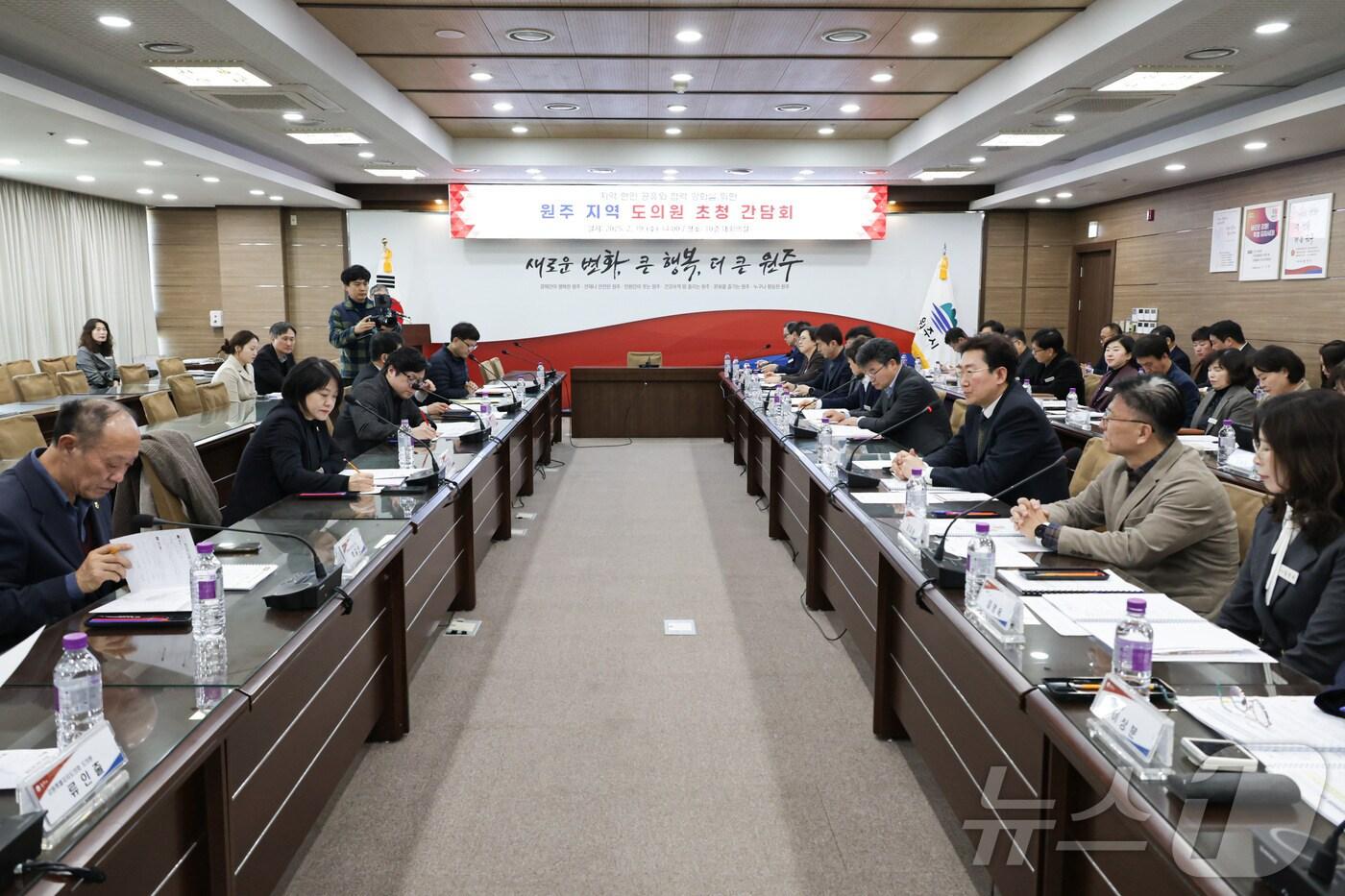 강원 원주시가 19일 시청 대회의실에서 원주지역 강원특별자치도의원들을 초청해 현안 산업과 관련한 간담회를 가졌다. (원주시 제공. 재판매 및 DB금지) 2025.2.19/뉴스1관련 키워드강원특별자치도의원원주시원강수박윤미현안초청논의신관호 기자 "석탄공사 부채를 강원랜드가 갚으라고?"…지역사회 반발"신천지 문제로 갈등" 아내 살해 60대에 징역 15년 구형관련 기사원주시, 도의원 초청 국정과제 건의 등 현안 논의