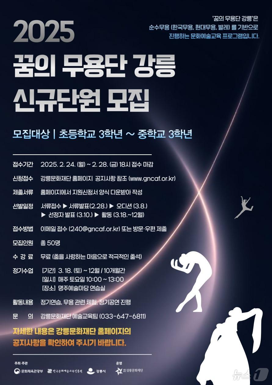 강릉문화재단, ‘꿈의 무용단 강릉’ 2025 신규 단원 모집 홍보물.(강릉시 제공, 재판매 및 DB 금지) 2025.2.20/뉴스1관련 키워드강릉강릉문화재단꿈의무용단강릉윤왕근 기자 "아이 아팠던 그 밤" 시작된 변화…강릉 부모 연대 'HB1985' 아시나요삼척시, 슬레이트 처리 연계 빈집정비 추진…도시환경 개선 속도관련 기사'꿈의 무용단 강릉' 평창서 열리는 꿈의 페스티벌 참가강릉시, 문체부 '꿈의 극단' 운영사업 최종 선정