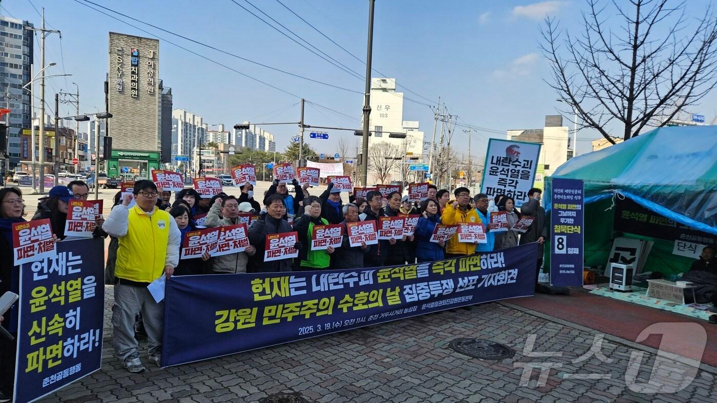 강원 시민단체, 정당들이 19일 춘천 거두리사거리에서 헌법재판소에 윤석열 대통령의 즉각 파면을 촉구했다.2025.3.19 한귀섭 기자강원 시민단체, 정당들이 19일 춘천 거두리사거리에서 헌법재판소에 윤석열 대통령의 즉각 파면을 촉구했다.2025.3.19 한귀섭 기자 관련 키워드강원춘천원주강릉대통령尹비상계엄선포한귀섭 기자 강원경찰청, '휴대용 열화상 카메라' 등 맞춤형 장비 9종 도입신축 공사·전원주택 분양 미끼로 20억 원 가로챈 50대 재판행관련 기사김 총리, 강원 주민들에 '균형 발전·글로벌 거점 도약' 설명강릉원주대, 중앙아시아 교육기관 초청 연수…유학생 유치 시동강원교육청, 교육감입학전형 고등학교 신입생 5487명 23개교 추첨 배정싸움말리던 상대 폭행하고 영장 청구되자 잠적한 40대 2심도 실형춘천·원주 등 15개 지역 한파주의보 해제