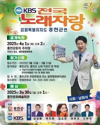 30일 예심 당일 정오부터 현장 접수도 가능전국노래자랑 홍보 포스터.(홍천군 제공. 재판매 및 DB금지)/뉴스1관련 키워드홍천전국노래자랑공개녹화참가신청이종재 기자 강원도, 핵심 광물 '텅스텐' 육성 방안 발표…"100% 자급 체계 구축"양구군, 천연기념물 산양 보호 나선다…먹이 공급·밀렵 방지 홍보관련 기사KBS 전국노래자랑 홍천군편 4월1일 공개 녹화