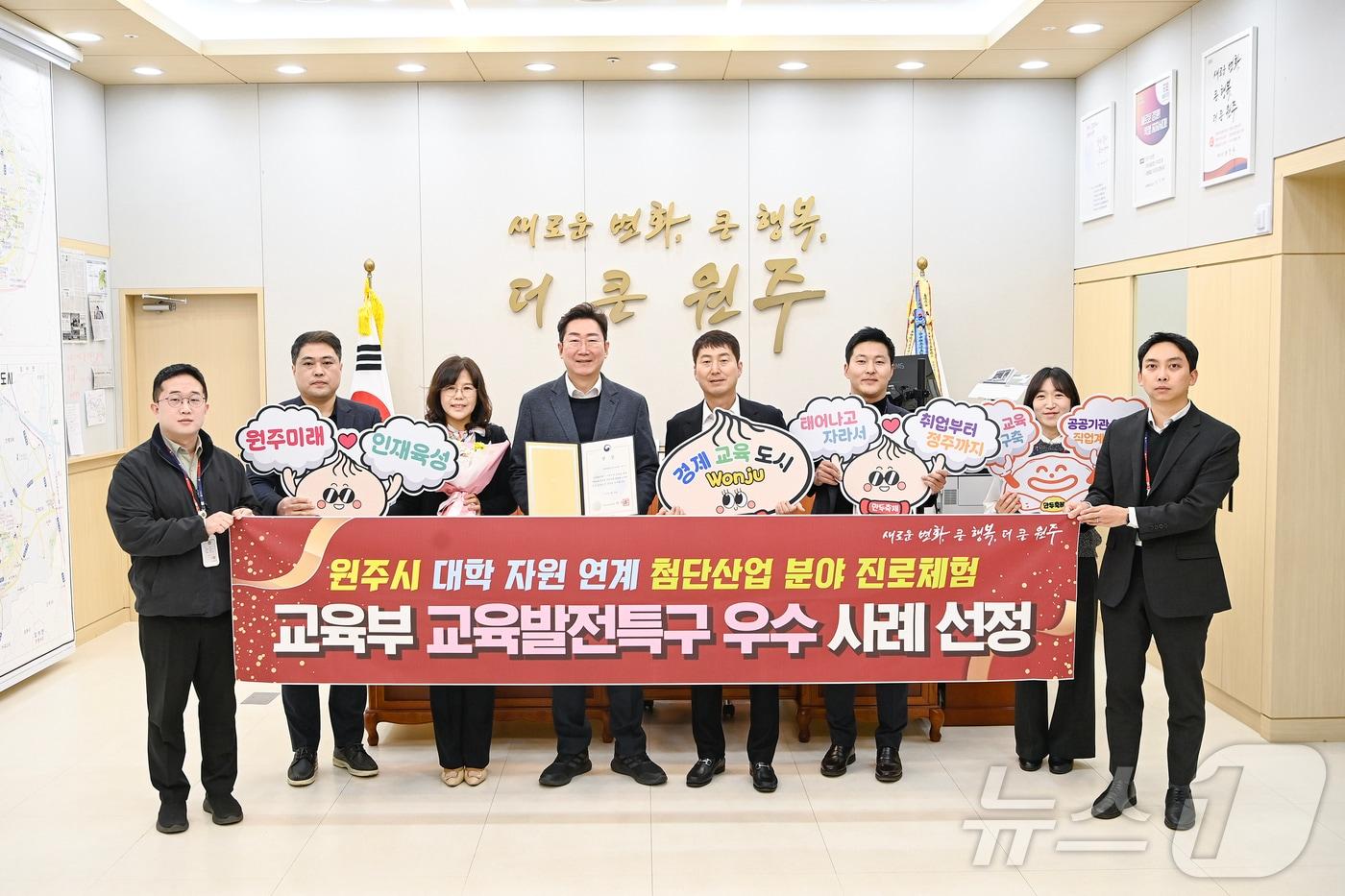 강원 원주시의 '대학연계 첨단산업 분야 진로체험 교육사업'이 최근 교육부의 교육발전특구 우수사례에 선정된 가운데, 시 관계자들이 원강수 원주시장 집무실에서 기념사진을 촬영하고 있다. (원주시 제공. 재판매 및 DB금지) 2025.3.21/뉴스1관련 키워드원주시교육발전특구우수사례대학연계첨단산업진로체험신관호 기자 '결혼 앞두고, 여친의 지인 추행'…30대 원주 공무원 실형·해임'정신질환자 의사결정 도움'…영월군, 공공후견 돌봄 추진관련 기사원주시, 교육발전특구 8대 핵심과제 집중 추진 중
