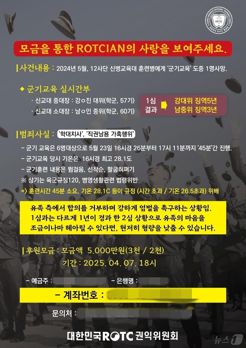 '대한민국ROTC중앙회' 산하 권익위원회가 모금 주도논란 일자 ROTC "모금 담당자에게 모금 중단하라고 해"'대한민국ROTC중앙회' 산하 ROTC 권익위원회 모금 운동.(독자제 공, 재판매 및 DB금지)관련 키워드강원12사단중대장부중대장한귀섭 기자 원주 가현동 하천서 70대 실종 하루 만에 숨진 채 발견영월서 그랜저·쏘렌토 충돌…1명 사망·5명 중경상관련 기사'훈련병 가혹훈련 사망' 중대장, 징역 5년6개월형 최종확정[속보]'훈련병 가혹훈련 사망' 중대장, 징역 5년6개월 확정"지휘관이 후진적 병영문화 답습" 훈련병 사망 중대장 형량 늘어(종합)'훈련병 사망' 중대장 2심서 형량 늘어…징역 5년6개월'훈련병 사망' 학대치사 혐의 중대장·부중대장…2심 판단은