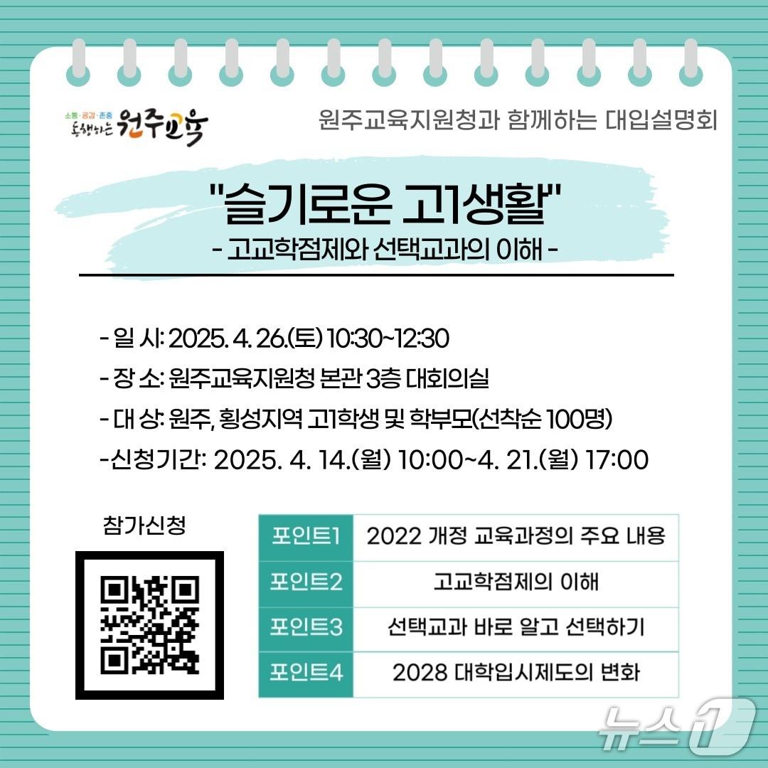 강원 원주교육지원청, 대입제도 변화에 대한 이해를 돕는 진로·진학 설명회.(원주교육지원청 제공, 재판매 및 DB금지)관련 키워드원주한귀섭 기자 '정선 만항재 11.9㎝' 밤사이 강원 영서·산간 눈…빙판길 주의[오늘의 날씨] 강원(13일, 화)…아침 최저 -9도, 빙판길 주의관련 기사"원주경제 활성화 위해"…시의회문화도시위·시번영회 간담회"도와준다고 믿었는데"…여중생 제자 상대로 성범죄 30대 교사프로농구 올스타전, '부상' 타마요·하윤기 대신 이관희·라건아 합류원주시, 겨울철 대설대비 안전사고 예방 캠페인원강수 원주시장, 오늘부터 전 읍면동서 '주민과 대화'