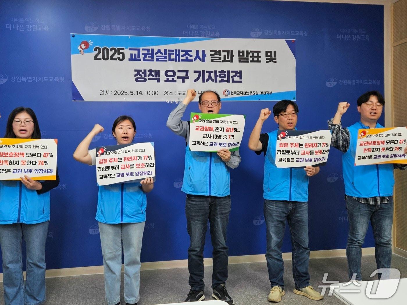 전교조 강원지부 '2025 강원 교권 실태 조사 결과' 발표전국교직원노동조합 강원지부는 14일 도교육청 브리핑룸에서 '2025 강원 교권 실태 조사 분석 및 정책 제안' 기자회견을 열고 도교육청의 실질적인 대책 마련을 촉구하고 있다.2025.5.14 한귀섭 기자관련 키워드강원교육교사갑질한귀섭 기자 강릉 연곡면 신왕리서 산불…헬기 투입 2시간17분만에 진화(종합)동해안 해맞이 30만명 예상…경찰 기동대 명소에 배치 '사고 예방'관련 기사지인 노후자금 등 14억 가로챈 60대…일부는 도박장서 탕진'불법 선거' 신경호 강원교육감 항소심서도 무죄 주장신경호 강원교육감 내일 항소심…교육·시민단체 "신속 재판해야"대구대 사범대학 동아리, '교육기부 대상'…청소년 성장 지원강삼영 전국교육자치혁신연대 상임대표, 강원교육감 출마