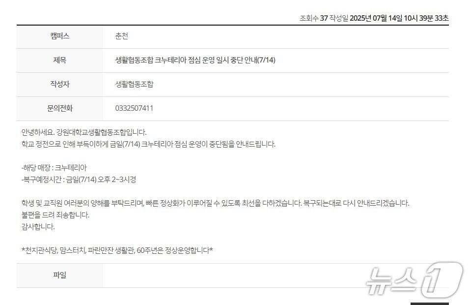 강원대학교 춘천캠퍼스 정전에 따른 공지사항.(홈페이지 캡처. 재판매 및 DB금지)관련 키워드춘천한귀섭 기자 "속초 '72정' 인양 2027년 착수 가능할듯"…실종자 가족 "희망 생겼다"강원경찰청·강원경찰장학회, 직원 자녀 장학금 수여행사 개최관련 기사농어촌공사 강원본부, 조직 개편·지사 명칭 변경…1월 1일 시행춘천시, 시청광장서 해넘이·해맞이 행사춘천시 국제도시화위원회 하반기 회의 개최강원교육청, 춘천 온의·삼천지구 초등학교 설립방안 의견수렴 추진국립춘천숲체원, 산불피해목으로 친환경 플라잉디스크 개발
