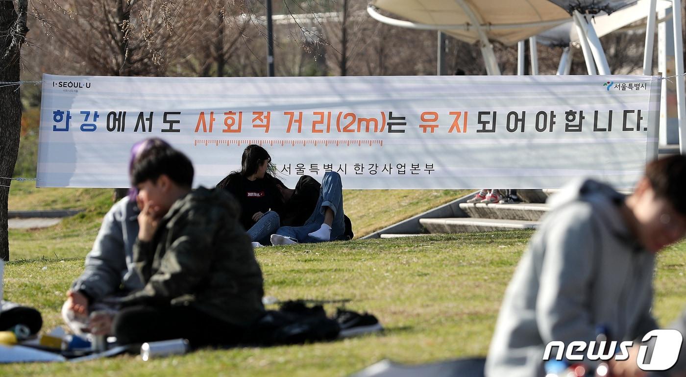 27일 오후 서울 뚝섬 한강공원에 사회적 거리두기 현수막이 걸려 있다. 이날 정부는 이번 주말 야외활동을 자제하고 사회적 거리두기에 동참해 줄 것을 호소했다. 2020.3.27/뉴스1 ⓒ News1 박지혜 기자