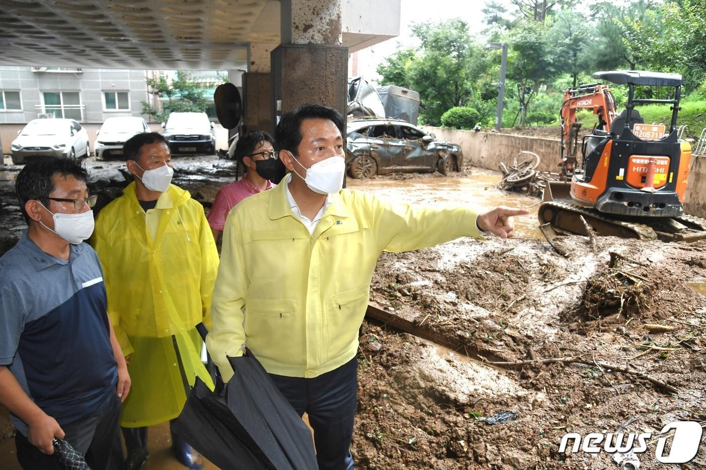 서울시 수해 대책 발표…"강남역·도림천·광화문 2027년 완공"박원순, 7곳에서 1곳으로 축소…吳 "尹, 국비 지원 긍정 반응"오세훈 서울시장이 9일 서울 구로구 개봉동에서 전날 내린 폭우로 산사태가 발생한 현장을 점검하고 있다. (서울시 제공) 2022.8.9/뉴스1
