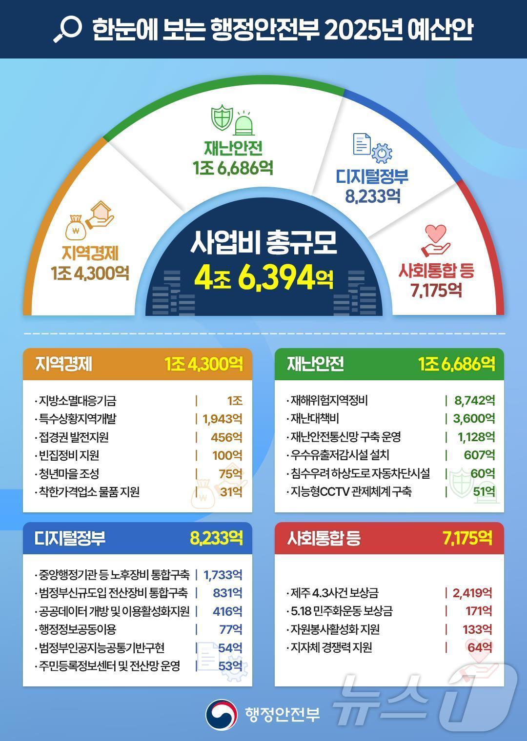 [2025 예산] 사업비 6494억원 감소한 4조6394억 원전체 예산은 3601억↓…재난안전 1조6686억원으로 최다행정안전부 예산.관련 키워드2025예산안행정안전부이설 기자 [동정] 오세훈, 고위공직자 대상 청렴 교육 수강전국 집중호우로 대피 3555명 '미귀가'…도로·철도 곳곳 통제관련 기사천창수 울산교육감 "독서·토론교육 강화로 수업 혁신"李대통령, 공직사회 '신상필벌' 강조 "사고뭉치 골라내 책임 물어야"(종합)대전시의회, 3회 추경예산안·2회 기금운용계획변경안 의결李대통령, 첫 해 다자외교 마무리 귀국…12·3계엄 D-7, 내치 복귀신정훈 "'지역사랑상품권법 철회 건의안 부결' 여수시의회에 감사"