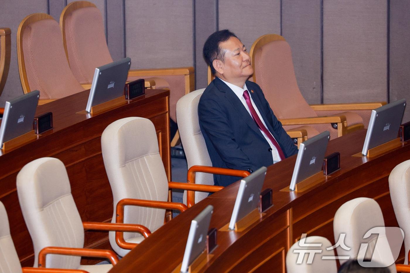이상민 행정안전부 장관이 19일 오후 서울 여의도 국회에서 열린 제418회국회(정기회) 제8차 본회의에서 지역사랑상품권 이용 활성화에 관한 법률 일부개정법률안(대안) 찬반 토론을 듣고 있다. 2024.9.19/뉴스1 ⓒ News1 안은나 기자