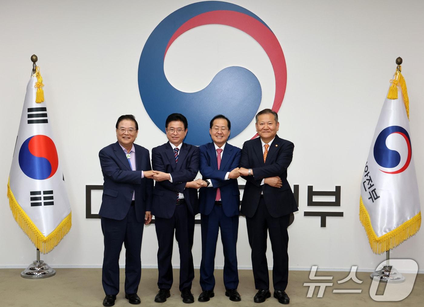 우동기 지방시대위원장(왼쪽부터), 이철우 경북도지사, 홍준표 대구시장, 이상민 행정안전부 장관이 21일 오후 서울 종로구 정부서울청사에서 열린 대구·경북 통합 관련 4자 회동에서 합의문에 서명한 뒤 기념촬영을 하고 있다. (공동취재) 2024.10.21/뉴스1 ⓒ News1 허경 기자