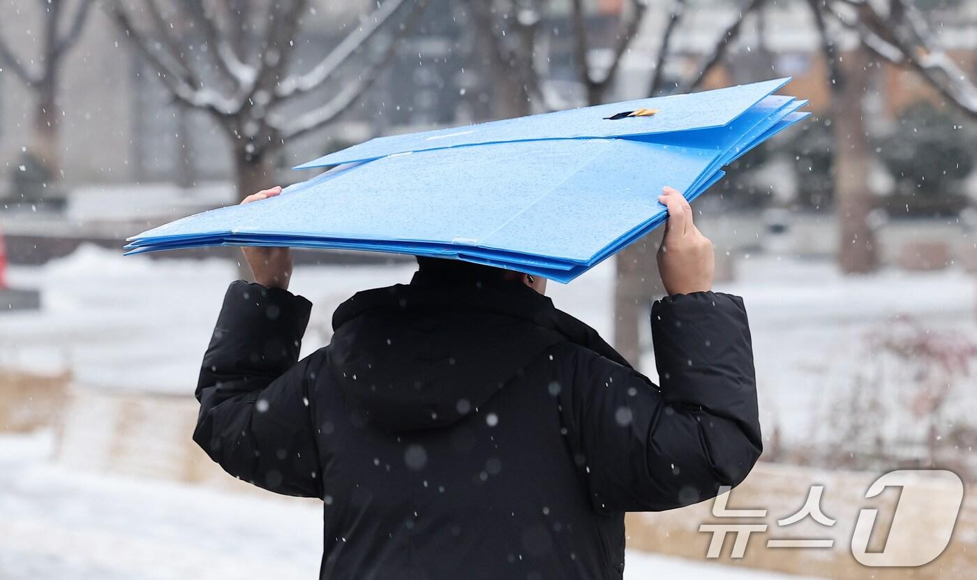 수도권 지역에 대설특보가 발효된 12일 오전 서울 종로구 광화문네거리에서 한 시민이 박스로 눈을 피하며 출근길을 서두르고 있다. 2025.2.12/뉴스1 ⓒ News1 김성진 기자