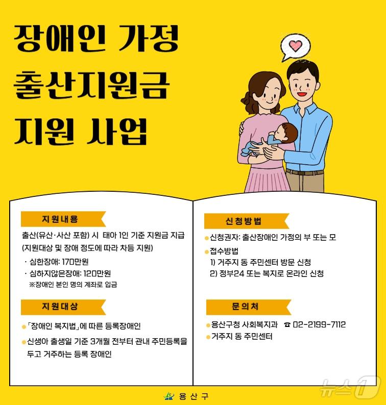 장애 정도 따라 최대 170만원 지급장애인 가정 출산지원금 지원사업 홍보물.(용산구청 제공)관련 키워드용산구서울장애인출산지원금한지명 기자 서울 강남구 구룡마을 화재…소방 '대응 2단계' 격상서울시, 농업인 역량 향상 위해 '새해 실용교육' 운영관련 기사"법률 시행령이 장애인 키오스크 접근성 축소"…헌법소원 제기3주 뒤 '배리어프리 키오스크' 전면 의무화…면제 조건은?"지하철역·복지관서 나이스샷"…도심 '파크골프장' 인기[서울in]생활쓰레기 배출 주6일로 확대…새해 용산구 이렇게 달라집니다金 총리 "차별 없는 무장애 도시로…국가가 해야 할 책무"
