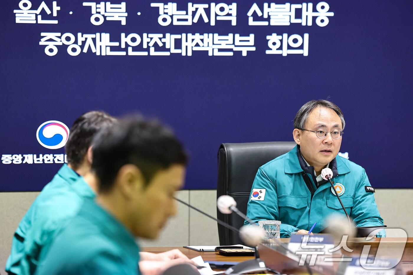 중대본 가동·재난사태 선포…범정부 대응 체계 전환고기동 행정안전부 장관 직무대행이 22일 서울 종로구 정부서울청사에서 울산·경북·경남지역 산불대응 중앙재난안전대책본부 회의를 주재하고 있다. 2025.3.22/뉴스1 ⓒ News1 김도우 기자관련 키워드행정안전부산불행정안전부한지명 기자 서울시, 농업인 역량 향상 위해 '새해 실용교육' 운영무더위·한파 쉼터 개선 논의…"다양한 유형 쉼터 필요"관련 기사산불 발생 위험 고조…봄철 산불조심기간 20일로 앞당겨 시행건조특보에 대형 산불 우려…행안장관, 선제적 대응 특별 지시'민방위 사이렌' 올해부터 호우·산불에도 가동…경기도 '재난 경보' 확대'화재 사망자 제로'…양구군, '지역안전지수' 주요 분야 1등급2024년 재난 사망·실종 387명…재산피해 1조418억 달해