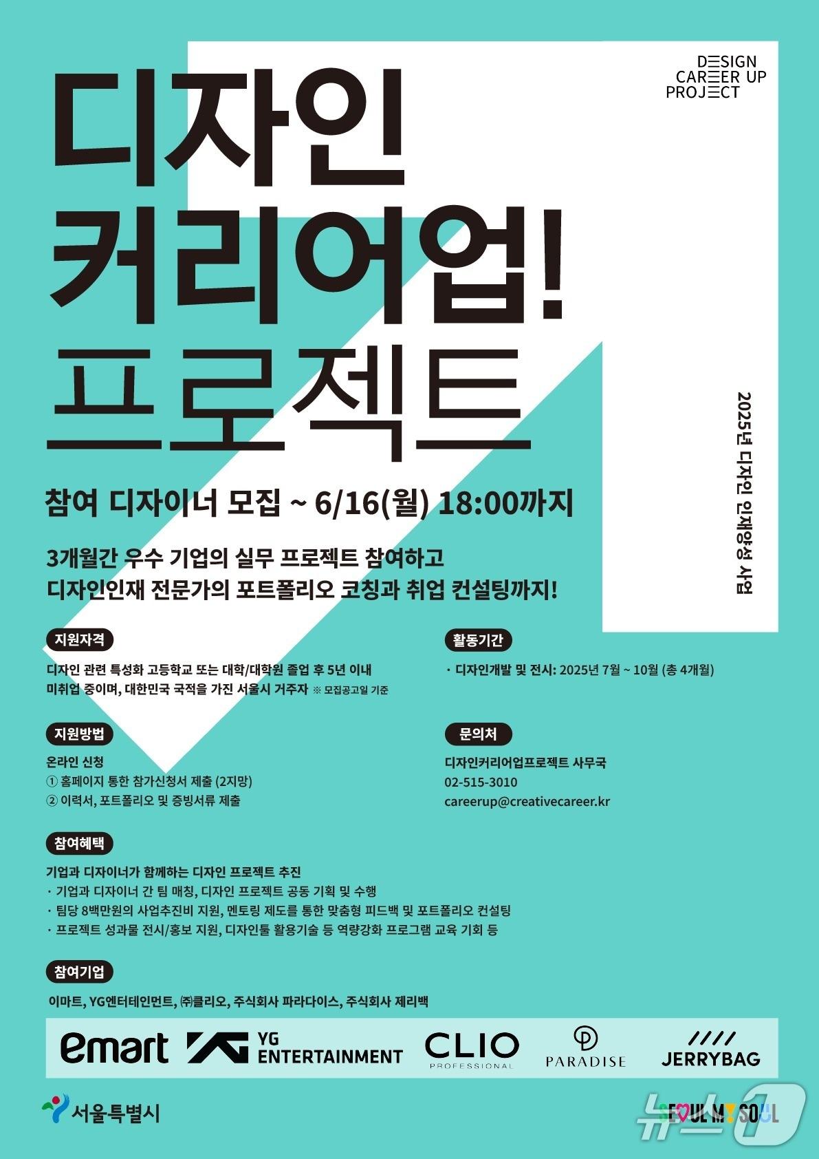 이마트, YG 등 참여…16일까지 참여자 모집디자이너 모집 포스터.(서울시 제공)관련 키워드서울시디자인커리어업프로젝트한지명 기자 성평등부, 범부처 영향력 강화…양성평등위 개편·임금공시제 추진(종합)李대통령 "반려동물도 가족"…'성평등가족부' 산하 가능성 시사관련 기사서울시, 기업과 함께하는 '디자인 커리어업 프로젝트' 출발서울시, 신진 디자이너와 기업 매칭…팀당 800만 원 지원