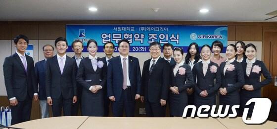 서원대학교와 (주)에어코리아는 20일 항공관광분야의 현장 실무 습득과 우수인력 양성을 위한 업무협약을 체결한 뒤 사진 촬영을 하고 있다. (서원대 제공) © News1