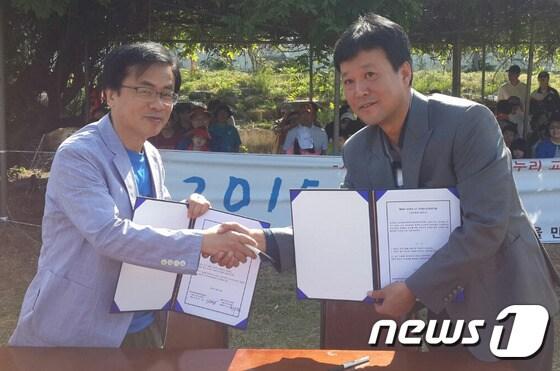 인간성회복운동추진협의회가 운영하고 있는 세종시 사랑의 일기 연수원은 25일 오전 연수원 운동장에서 대한예수교 장로회 세종 온누리교회와 업무제휴를 위한 협약식을 가졌다. 사진은 청소년 인성함양을 위한 업무협약을 체결한 뒤 고진철(오른쪽)연수원장과 선우권 목사가 기념사진을 찍고 있다.(인추협 제공) ⓒ News1