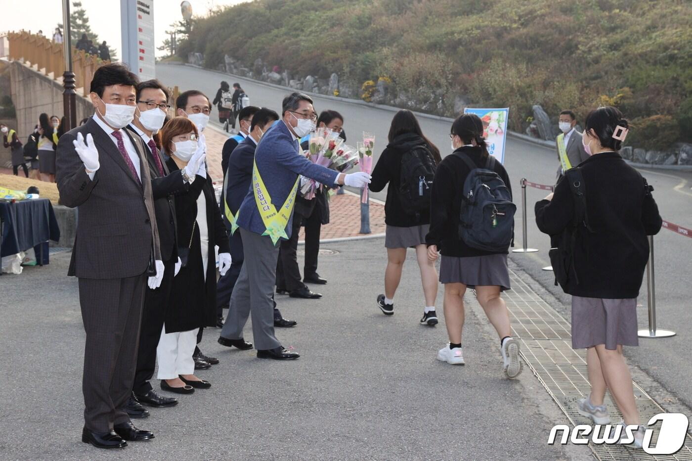 20일 오전 김병우 충북교육감이 청주 일신여고를 찾아 등굣길 학생 맞이를 하고 있다.ⓒ 뉴스1