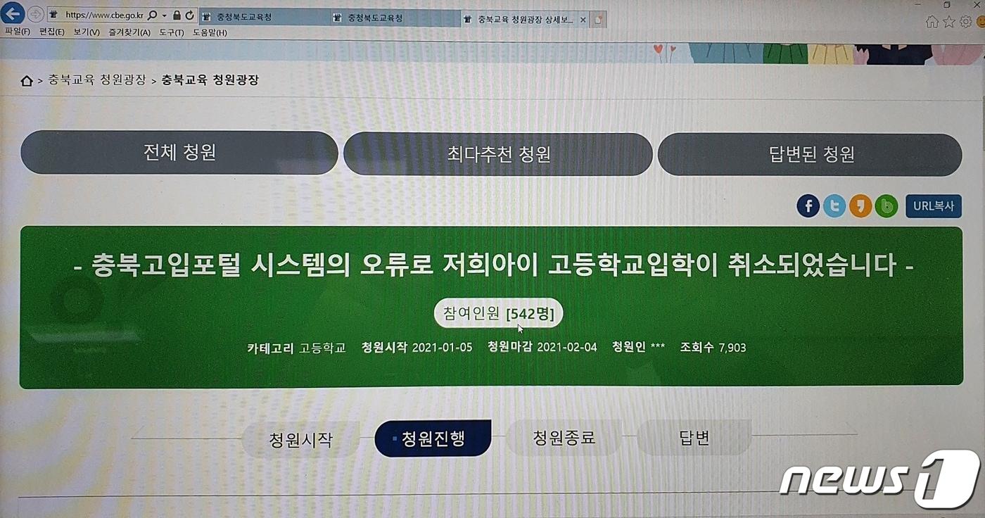 일반고를 자사고로 착각해 중복지원 등록한 탓 학부모 "충북 고입포털 시스템 오류" 대책 호소충북교육청 청원광장에 올라온 글.ⓒ 뉴스1이성기 기자 진천군 "고춧대 등 영농부산물 태우지 말고 파쇄하세요"증평군, 여성농업인 바우처 신청 다음 달 20일까지 접수