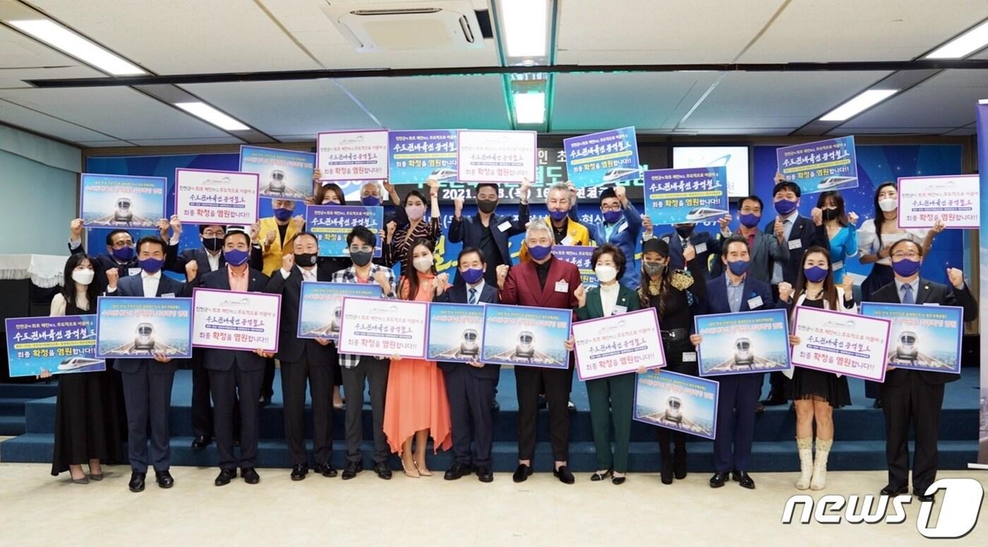 수도권내륙선 광역철도 국가계획 확정 염원에 힘을 보태기 위해 사단법인 안중근의사 문화예술연합회 소속 연예인 다수가 충북 진천군을 방문했다.ⓒ 뉴스1