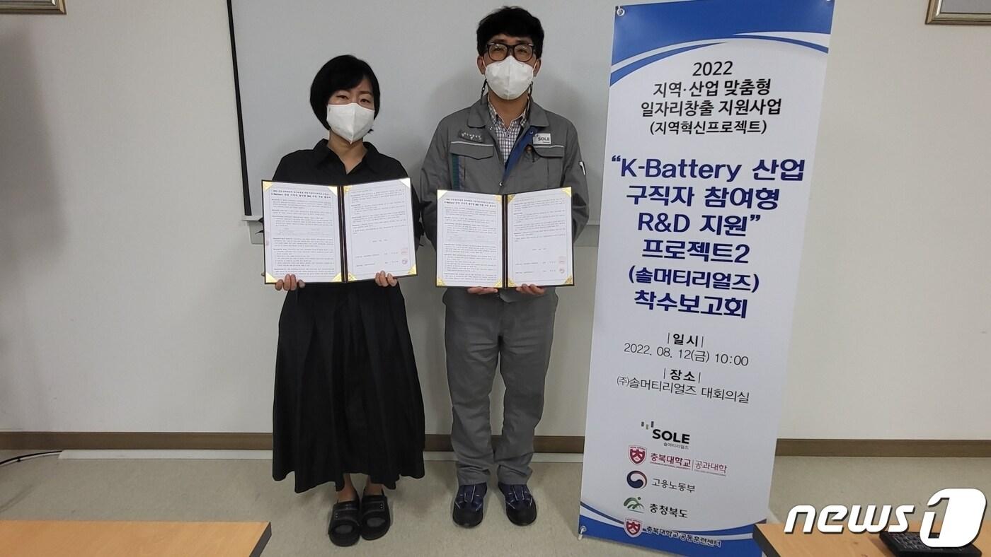 충북대학교 공동훈련센터는 12일 ㈜솔머티리얼즈에서 이 회사와 ‘지역혁신프로젝트(K-Battery 산업 구직자 참여형 R&D 지원사업) 착수보고회’를 개최했다. 왼쪽부터 연선미 충북대 공동훈련센터장, 박현기 ㈜솔머티리얼즈 연구소장.(충북대학교 제공).2022.08.12. ⓒ News1 이성기 기자