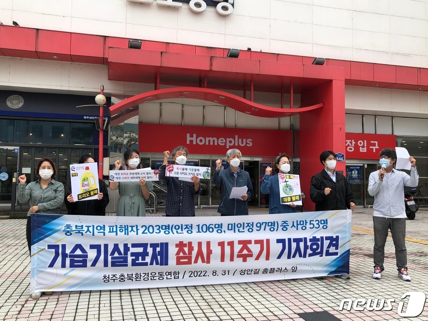 청주 대형마트 앞에서 가습기살균제 11주기 집회"피해 인정 및 가해기업 단죄로 재발 방지해야"청주충북환경운동연합은 31일 가습기살균제 피해 11주기를 맞아 청주의 한 대형마트 앞에서 이를 알리는 기자회견을 열고 있다.(청주충북환경운동연합 제공).2022.8.31/