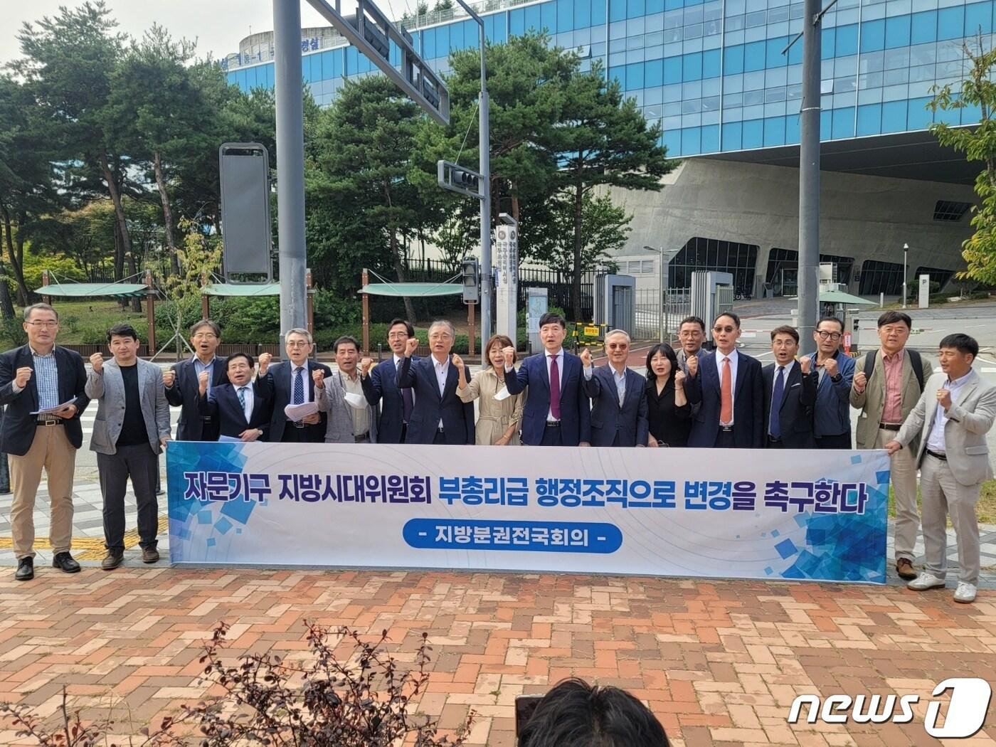 "대통령 자문기구에 불과하면 한 부처도 지휘, 관할 못해"입법예고된 '지방자치 분권 균형발전특별법'에 결함 주장28일 오후 지방분권전국회의 지역 대표들이 정부세종청사 국무총리실 정문 앞에서 부총리급 지방분권, 지역균형발전 조직 설치를 촉구하는 기자회견을 하고 있다. ⓒ News1 장동열 기자장동열 기자 최민호 세종시장 "행정절차에 인공지능 적극 활용해야"남세종종합청소년센터 '청소년수련시설' 최우수 선정
