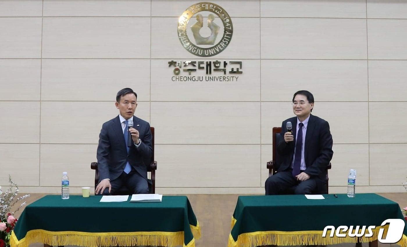 최현만 미래에셋증권 회장(왼쪽)과 한상춘 한국경제신문 논설위원이 29일 오후 청주대학교 청암홀에서 명사특강을 진행하고 있다.(청주대학교 제공)/ 뉴스1