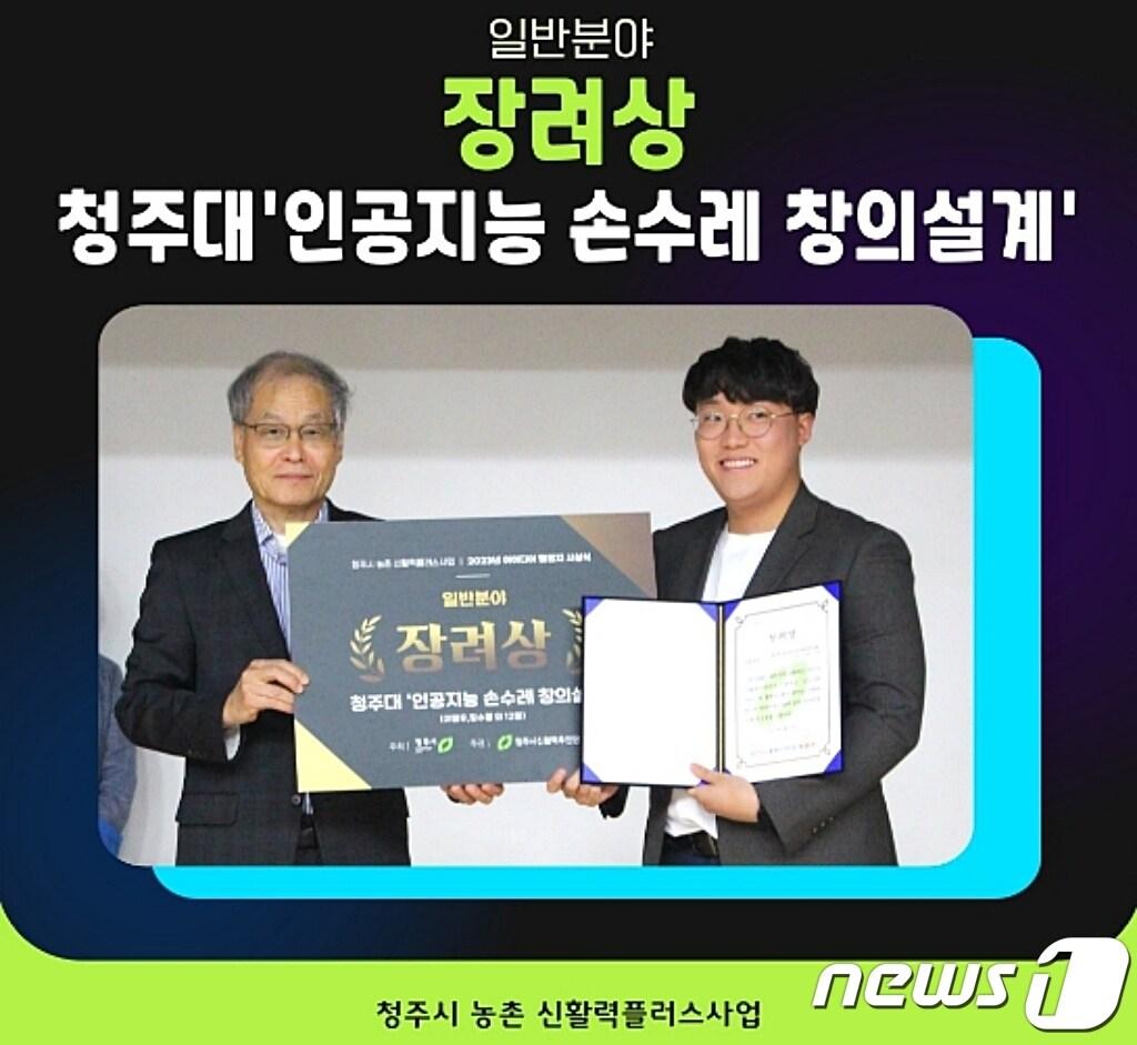'인공지능 손수레 창의설계팀' 농어촌 일손 문제 해법 제시청주대학교 항공기계공학과 이영우 학생(인공지능 손수레 창의설계 팀장, 오른쪽)이 청주시도시재생지원센터 신활력추진단에서 주최한 아이디어 챌린지 시상식에서 장려상을 받고 있다.(청주대학교 제공)/ 뉴스1관련 키워드청주대학교이성기 기자 진천군, 성인문해교육 문집 출간 기념 문학전 개최'K4리그 참여' 진천 HRFC창단…진천군, 스포츠 강군 발돋움관련 기사청주대 치위생학과, 국가시험 3년 연속 전원 합격청주대 임상병리학과 졸업생 '임상병리사 국가시험' 전원 합격청주대 '학생이 가고 싶은, 학부모가 보내고 싶은 대학'청주대성고 축구부 '승리관' 준공식…충북교육청·도의회 지원한국여자축구연맹, '2025 초등·중등 동계클리닉' 개최