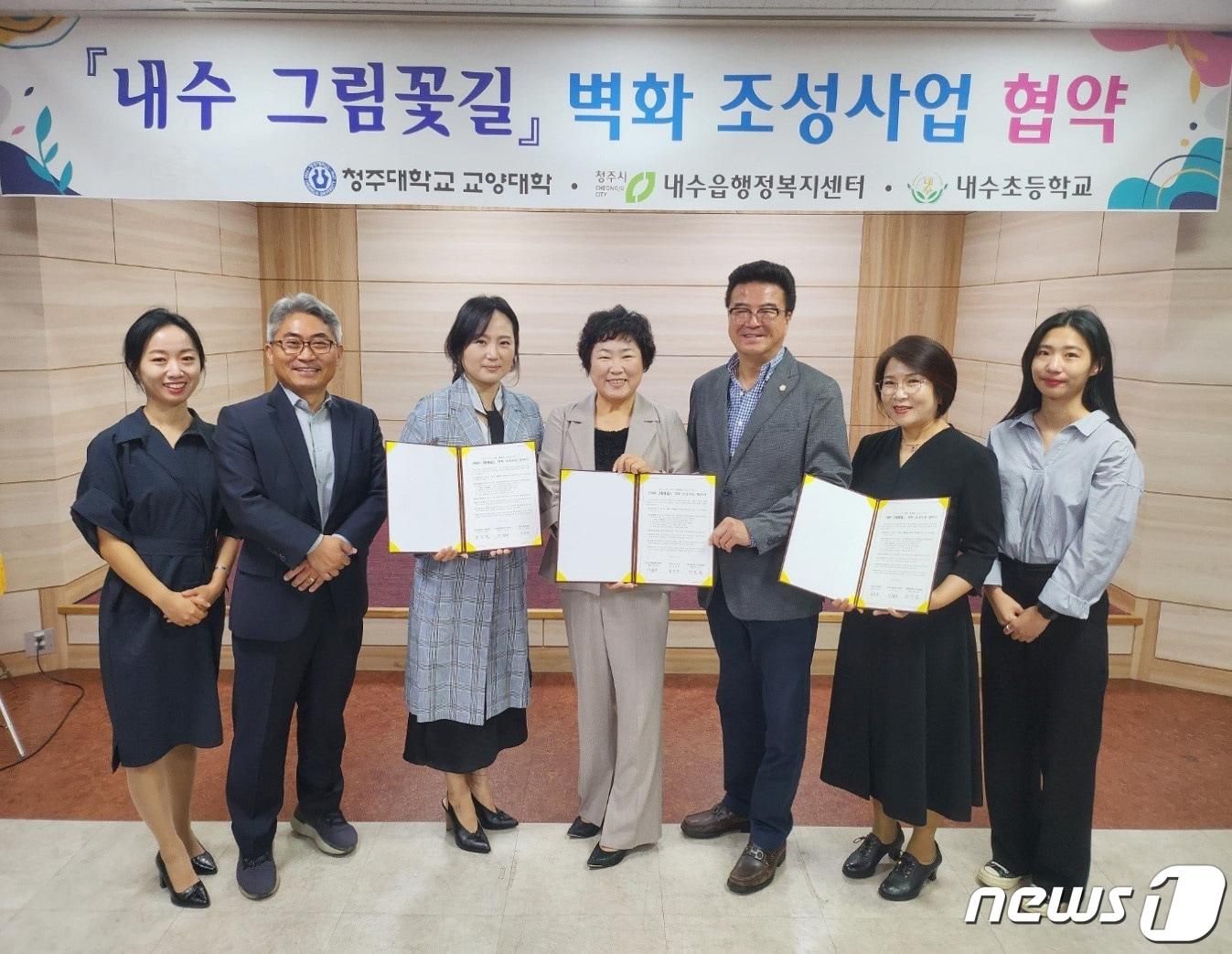 내수읍-내수초와 공동 협약⋯10월 중 완료 예정청주대학교는 25일 내수읍 행정복지센터, 내수초등학교와 '내수 그림 꽃길' 벽화 조성사업 협약을 했다.(청주대 제공)/ 뉴스1관련 키워드청주대학교내수읍이성기 기자 진천군, 성인문해교육 문집 출간 기념 문학전 개최'K4리그 참여' 진천 HRFC창단…진천군, 스포츠 강군 발돋움관련 기사푸드트럭 축제부터 베이커리 페스타까지…축제로 물든 청주시