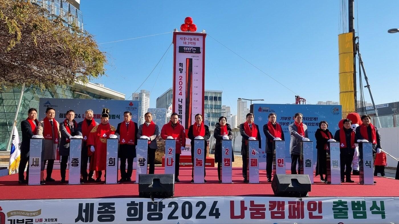 1일 오전 세종시청 앞 광장에서열린 세종 희망 2024 나눔캠페인 출범식에서 서영석 세종시 한글빵 대표(왼쪽 세번째)가 아너소사이어티 신규 회원 가입을 약속한 뒤 최민호 시장(오른쪽), 박상혁 세종사회복지공동모금회 회장(왼쪽 두번째)과 기념사진을 찍고 있다. / 뉴스1 관련 키워드사랑의온도탑희망나눔캠페인세종모금회장동열 기자 최민호 세종시장 "행정절차에 인공지능 적극 활용해야"남세종종합청소년센터 '청소년수련시설' 최우수 선정관련 기사타이어뱅크 '희망 2026 나눔 캠페인'에 1억 기부세종 '사랑의 온도탑' 점등식…20억4000만원 모금 목표전국 기온 '뚝' 6도 안팎 출근길…미세먼지 '나쁨'(종합)세종시 '사랑의 온도탑' 100도 조기 달성…목표 초과