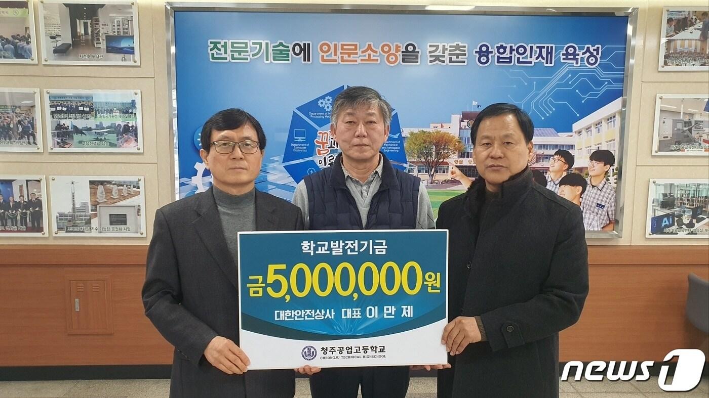 청주공업고등학교 36회 졸업생 이만제 ㈜대한안전상사 대표(가운데)가 모교인 청주공업고등학교에 3년째 장학금을 기탁했다.(충북교육청 제공)/뉴스1