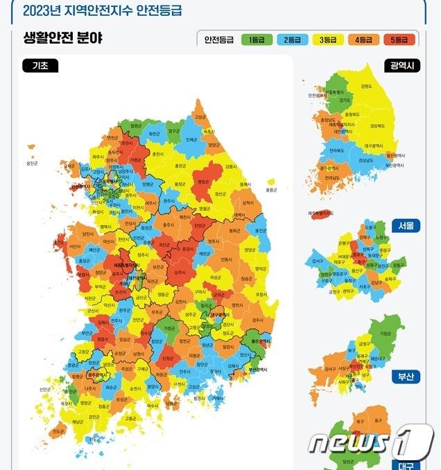 행안부 평가, 교통사고·화재·범죄·생활안전 등 3등급자살부문 강원도 이어 전국 최하위권 기록충북지역의 안전지수가 전국의 다른 시·도에 비해 낮은 것으로 드러났다. 생활안전분야에서도 3등급에 머물렀다.(행안부 제공)2024.2.20/뉴스1관련 키워드안전등급충북도2023지역안전지수관련 기사제천시 '지역안전지수' 전년보다 소폭 상승TS, 지자체 교통안전 실태조사 나선다…"맞춤 컨설팅 지원"횡단보도 정지선 준수율 '개선'…방향지시등·제한속도는 '하락'