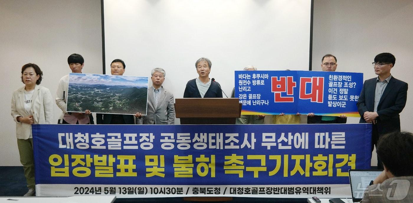 대청호 골프장 반대 범유역대책위원회는 13일 충북도청 브리핑룸에서 기자회견을 열어 "충북도는 대청호 골프장 건설을 불허해야 한다"고 촉구했다.관련 키워드대청호골프장김용빈 기자 민주당 충북도당 당원 명부 유출 의혹…중앙당 조사(종합)김영환 지사, 충북학사 재학생 대상 강연…청년정책 공유관련 기사대청호 유휴지 첫 파크골프장 조성…옥천군, 18홀 이달 착공전진선 양평군수 "민생경제 활성화 최선…TF 구성"황규철 옥천군수 공약사업 순항…상반기 추진율 79%양평군, 팔당 상수원에 친환경 선박 운항 및 파크골프장 조성 추진'대청호 골프장 조성' 충북도 용도변경 심의 조건부 통과