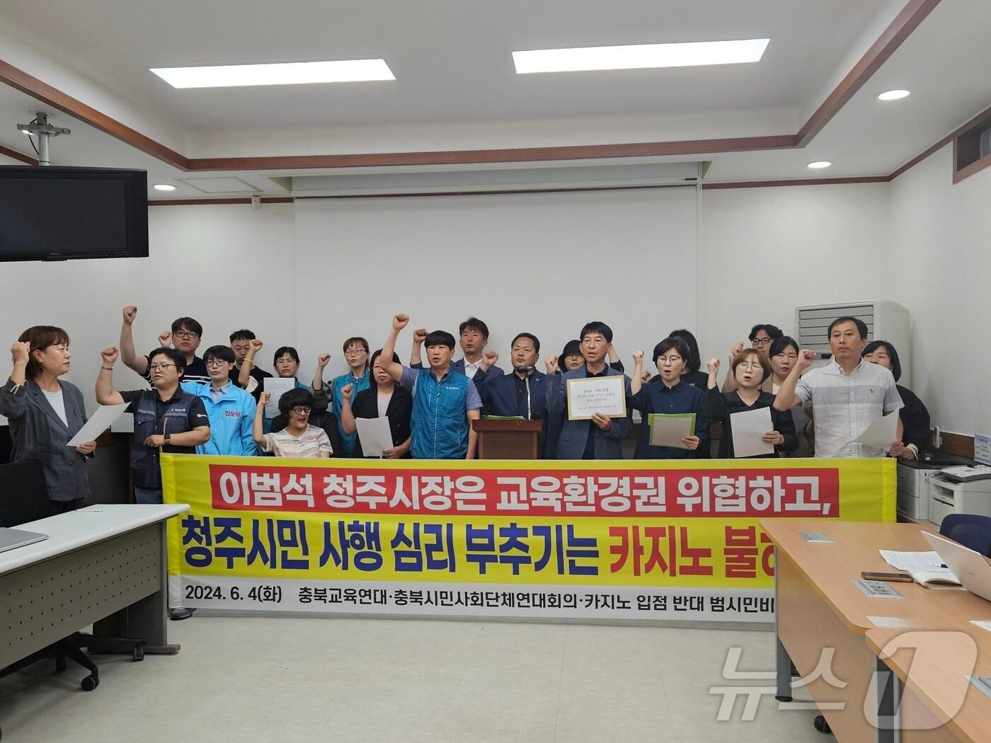 주변에 6개교 5000명 이상 학생…교육환경 위협충북교육연대와 충북시민사회단체가 청주시에 카지노 입점을 용납할 수 없다며 불허를 촉구하는 기자회견을 열었다.2024.6.4/뉴스1 이재규 기자관련 키워드청주카지노불허이재규 기자 충북 조류인플루엔자 확산세…진천 농장서 고병원성 AI 추가 확진청주청원경찰서–금융기관 7곳 '보이스피싱 근절' 맞손