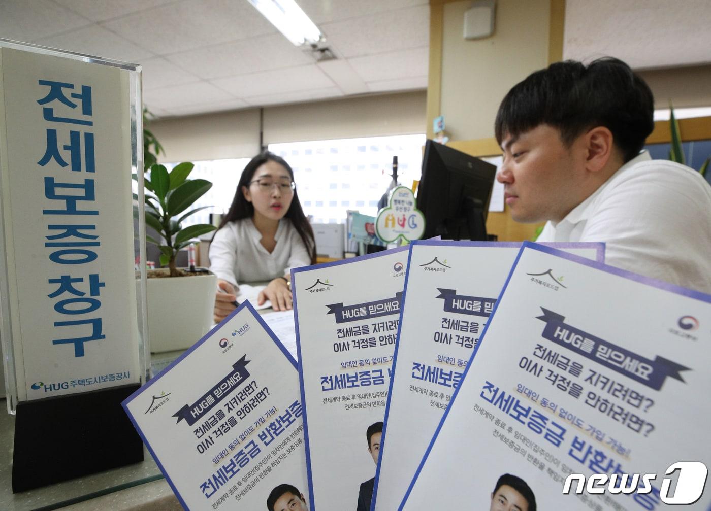 29일 서울 종로구 주택도시보증공사 북부지사에서 한 시민이 전세금 반환보증 상담을 받고 있다. 전세금 반환보증은 임차인이 집주인으로부터 계약기간 만료 후에도 전세보증금을 반환받지 못할 경우 보증 기관인 주택도시보증공사(HUG)가 대신 지급하는 상품이다. 기존 전세 보증은 전체 전세계약 기간의 절반이 지나기 전에 보증을 신청해야만 가입이 가능했지만 오늘부터는 전세계약 만료 6개월 전까지 보증을 신청하면 가입이 가능하다. 2019.7.29/뉴스1 ⓒ News1 신웅수 기자