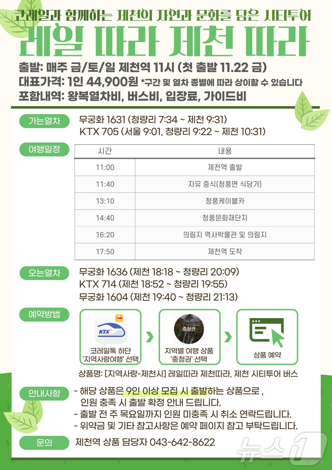 제천역, 시티투어 연계 '레일 따라 제천 따라'코레일 여행 상품 '레일따라제천따라' 리플릿.2024.11.11/뉴스1관련 키워드코레일제천의림지관련 기사코레일 부산경남본부 '제천 관광열차 상품' 운영코레일 '지역사랑 철도여행' 6개월 만에 6만여명 이용