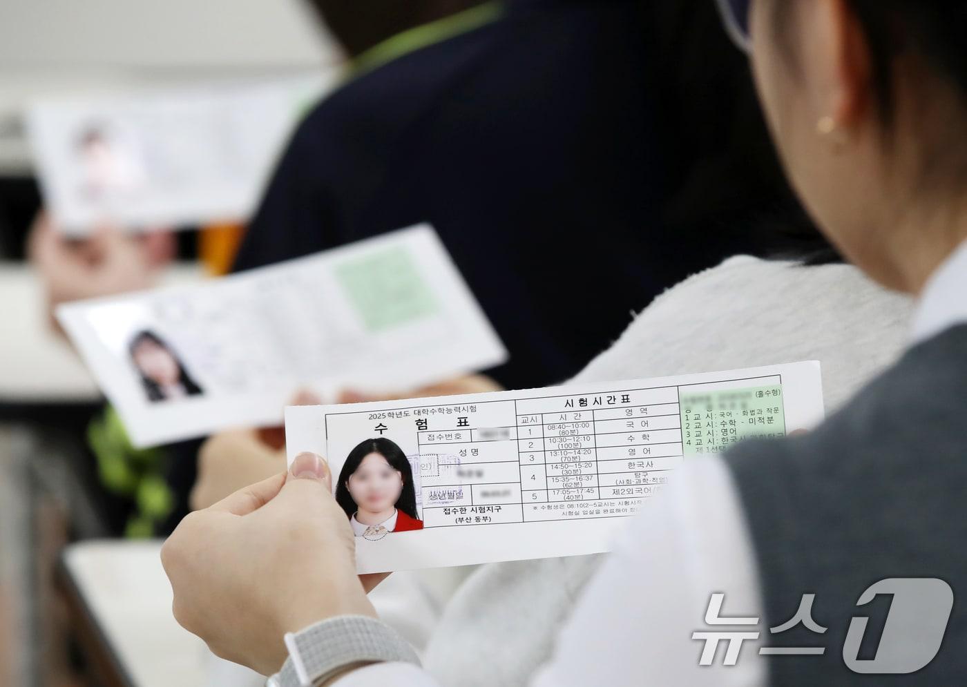 2025학년도 대학수학능력시험 예비소집일인 13일 오전 부산 동래구 동래여자고등학교에서 수험생들이 수능 수험표를 확인하고 있다. 2024.11.13/뉴스1 ⓒ News1 윤일지 기자관련 키워드충북수능문화행사수험생관련 기사[오늘의 주요일정] 충북·세종(13일, 목)"수능 대박 나세요"…영동군서 따뜻한 수험생 응원