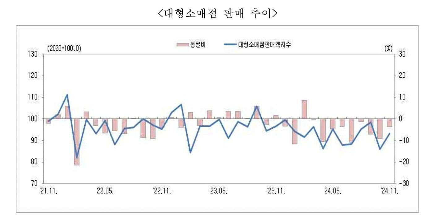 지난해보다 3.7% 하락, 최근 2년 중 최저충북 11월 대형소매점 판매액지수.(충청지방통계청제공)관련 키워드충북대형소매점박재원 기자 동남아 수출 호조로 충북 작년 수출액 26% 성장청주시 정주여건 개선 효과로 오송읍 인구 3년 새 두 배 증가관련 기사소비 심리 또다시 위축…충북 대형소매점 매출 '하락' 전환충북 대형소매점 모처럼 '반색'…매출 실적 지수 100 돌파충북 대형소매점 판매 실적 반등…전달보다 4.6% 상승3개월 연속 회복세 충북 대형소매점 매출 다시 하락충북 대형소매점 모처럼 '기지개'…판매실적 3개월 연속 회복세