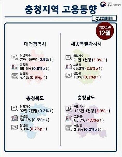 취업자 0.2%↓ 고용률 0.5%p↓ 실업자 33.3%↑ 실업률 0.7%p↑세종지역 12월 취업자 8000명↑ 고용률 2.5%p↑실업률 0.3%p↑2024년 12월 충청지역 고용동향.(충청지방통계청 제공)/뉴스1관련 키워드취업자고용률실업자실업률엄기찬 기자 윤건영 교육감 "고교학점제 여전히 혼란…충북이 해법 제시"충북교육청 "설 명절 전 각종 대금 조기 집행…민생 안정 도모"관련 기사부산 작년 12월 고용률 57.6%…1년 전보다 취업·실업자 늘어작년 취업자 19.3만명↑…청년 실업률 6.1%·건설 12.5만명↓ '한파'(종합2보)충북 경제활동인구·취업자 2%씩 증가…실업률 0.5%p 하락지난해 취업자 19.3만명↑…청년 실업률 6.1% 팬데믹 이후 최고(종합)대구 지난달 실업자 6만2000명…4년10개월 만에 최대