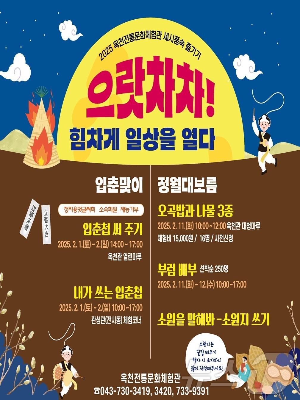 내달 1~2일 입춘첩 나눠 주기 등 진행옥천전통문화체험관 입춘·정월대보름 맞이 행사 홍보물 /뉴스1관련 키워드옥천군옥천전통문화체험관장인수 기자 옥천 행복나눔푸드뱅크마켓 취약계층 후원액 5억원 달성영동군보건소 택시 승차대 9곳 금연구역 지정관련 기사'핫플레이스' 옥천군 구읍 일원에 야간관광명소 생겼다[오늘의 주요일정] 충북·세종(24일, 수)[오늘의 주요일정] 충북·세종(23일, 화)"도심 전체가 공연무대"…변신 꾀하는 '옥천전국연극제'옥천군 구읍 관광브랜드 개발 공모전 개최…대상 500만원